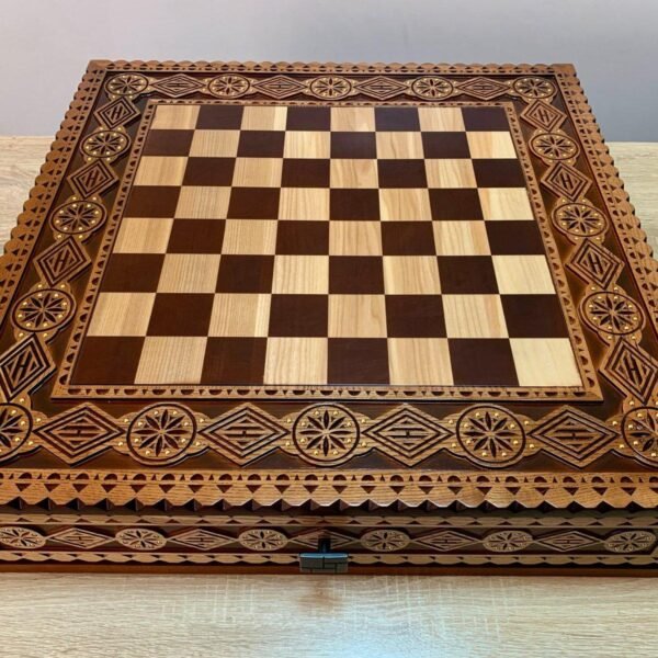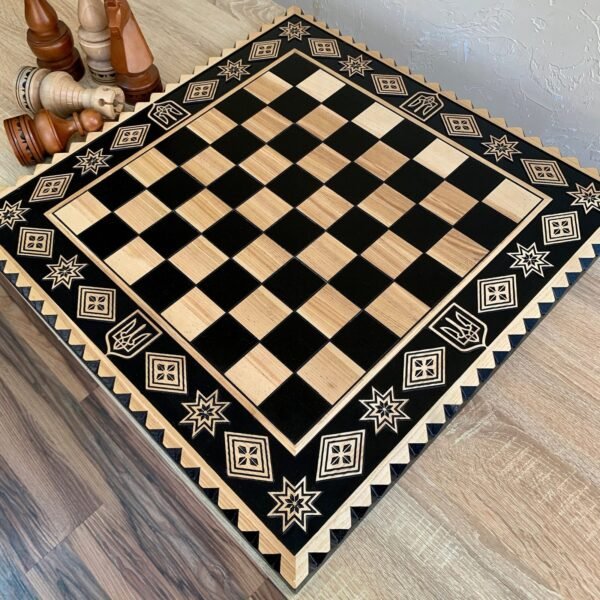 Handcrafted ash chess board with exquisite carvings: Trident and star of life emphasize the national spirit and uniqueness of the design.