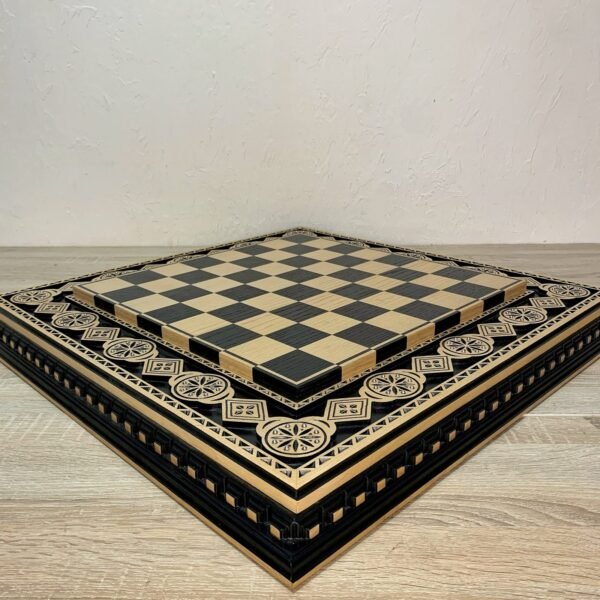 Classic handmade chess board made of ash with refined carving. Stylish and discreet design in dark tones.