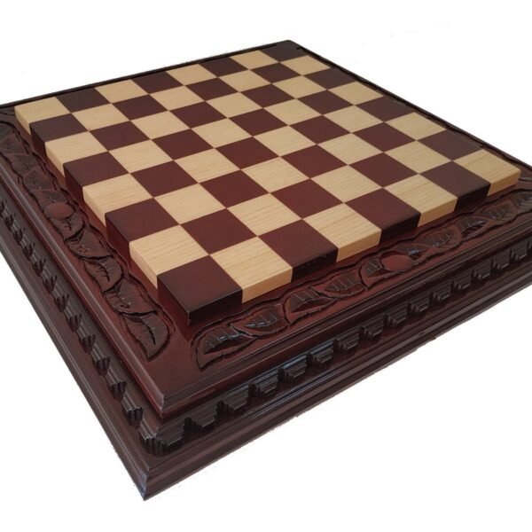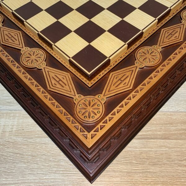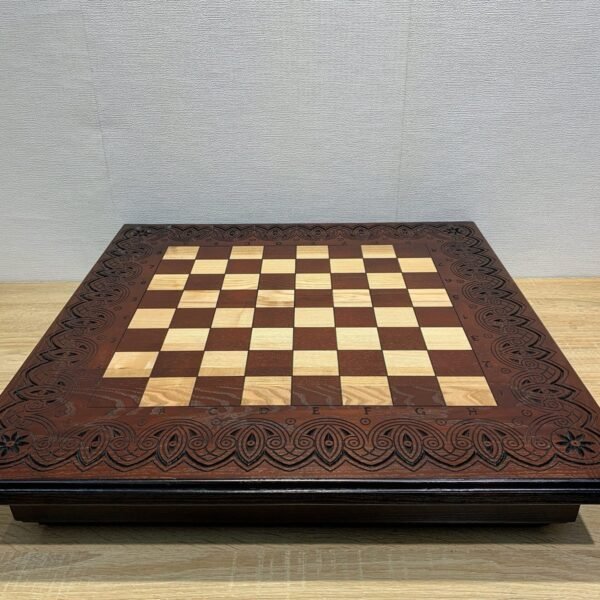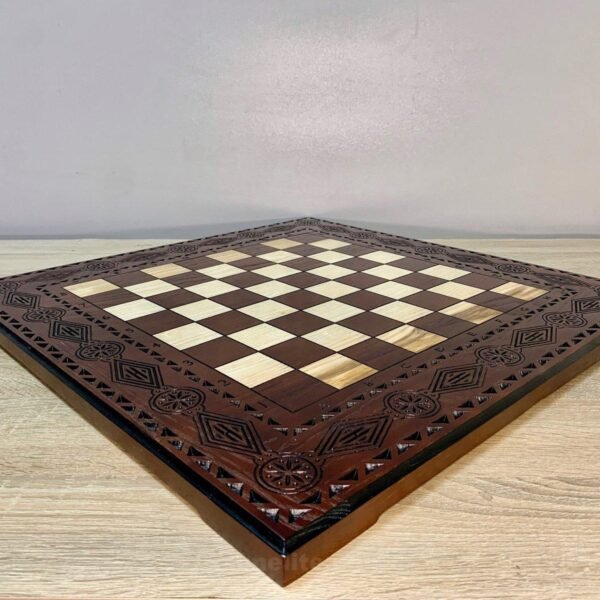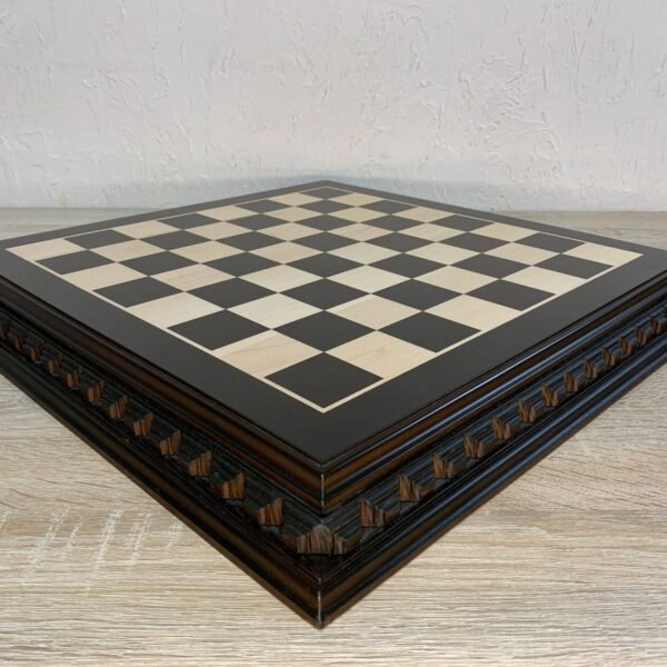 Handcrafted ash chess board in dark brown color. Decorated with delicate carved pattern - an elegant combination of classic and craftsmanship.