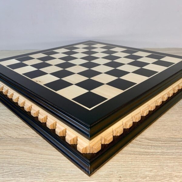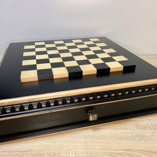 Premium chess board made of ash in black with light brown carving and bead inlay. Equipped with two drawers with velvet backing for neat storage of pieces.