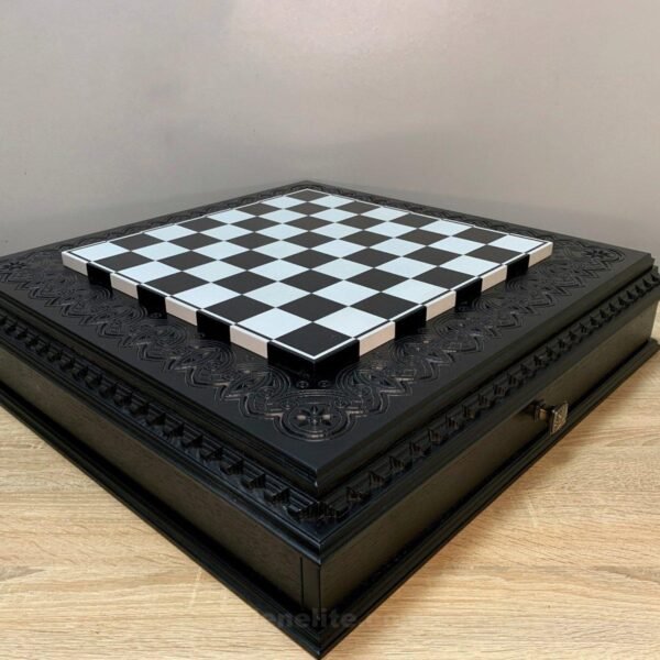 An elegant chess board with two storage drawers. The black and white design, velvet lining and carved details give the product a sophisticated style.