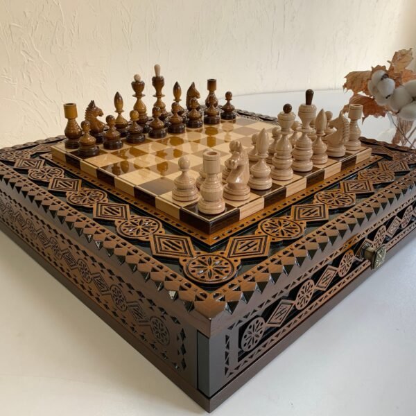 Wooden Chess Board, handmade wood carving, board with two drawers for storing pieces Classic Delux, Anniversary Chtistmas Gift