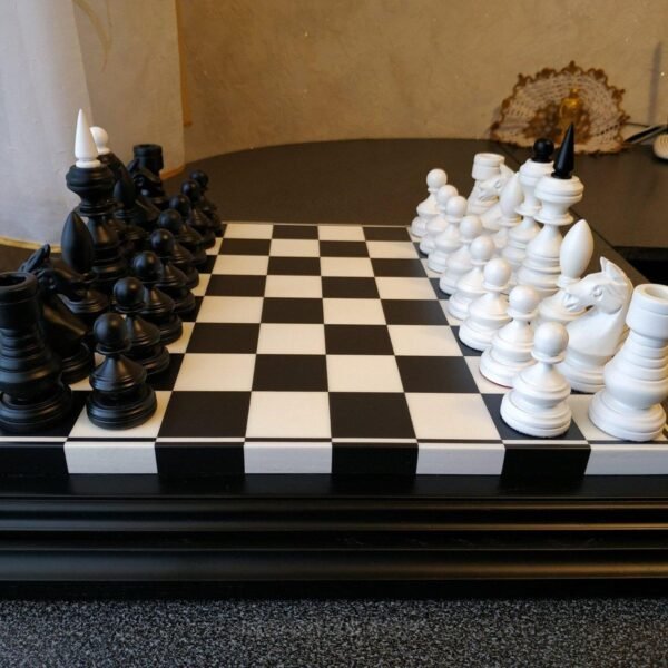 $1,550.00 – $1,856.00Price range: $1,550.00 through $1,856.00An elegant chess set with a round, glossy table and classic black-and-white pieces. The glossy surface creates a luxurious shine, while the built-in game board emphasizes the contrast and style.