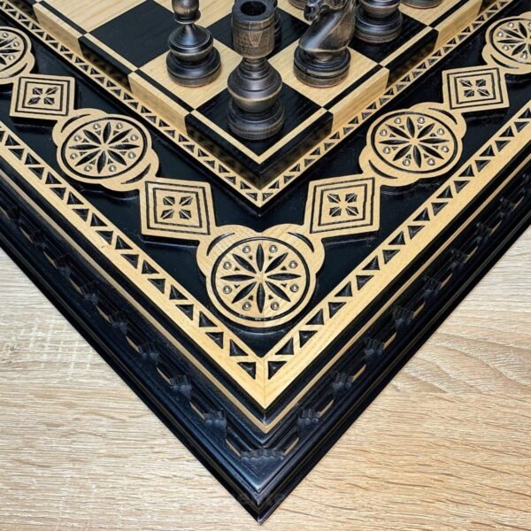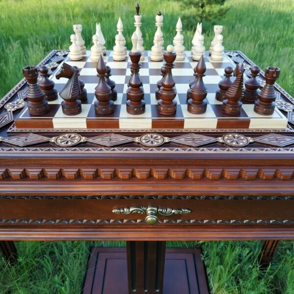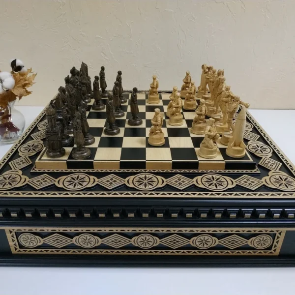$990.15 – $1,567.45Price range: $990.15 through $1,567.45A handcrafted ash chessboard with carvings and decorative inlays. It features two velvet-lined drawers. The chess set includes 32 pieces: 16 Knights and 16 Cossacks – a unique combination for an atmospheric game.