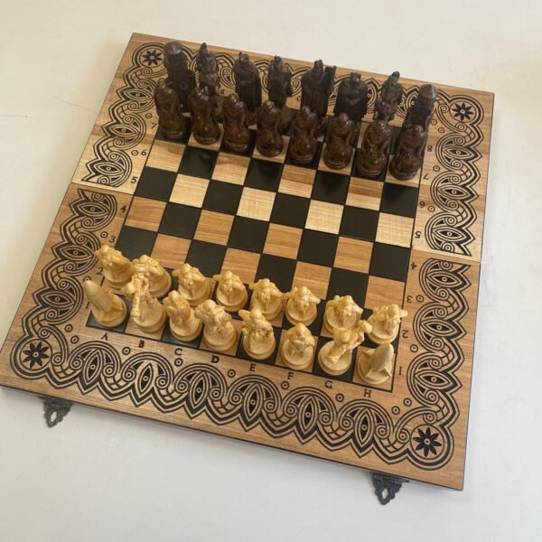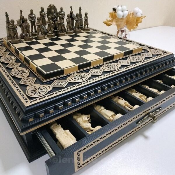 $990.15 – $1,567.45Price range: $990.15 through $1,567.45A handcrafted ash chessboard with carvings and decorative inlays. It features two velvet-lined drawers. The chess set includes 32 pieces: 16 – “Battle of Thrones”- themed and 16 medieval Knights.