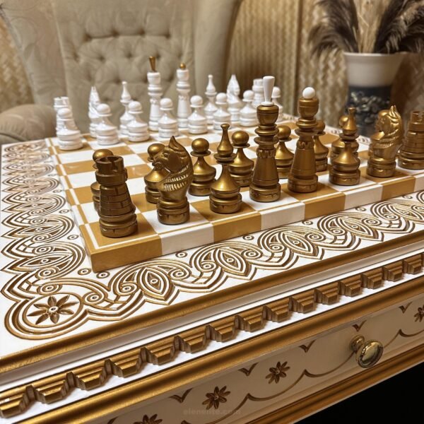 $2,480.00 – $2,906.00Price range: $2,480.00 through $2,906.00A wooden luxurious chess set: board with White & Gold color and a glossy shine. Two pull-out drawers with velvet – elegant and practical. 32 classic chess pieces.