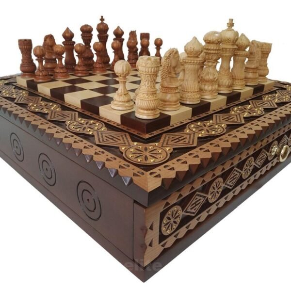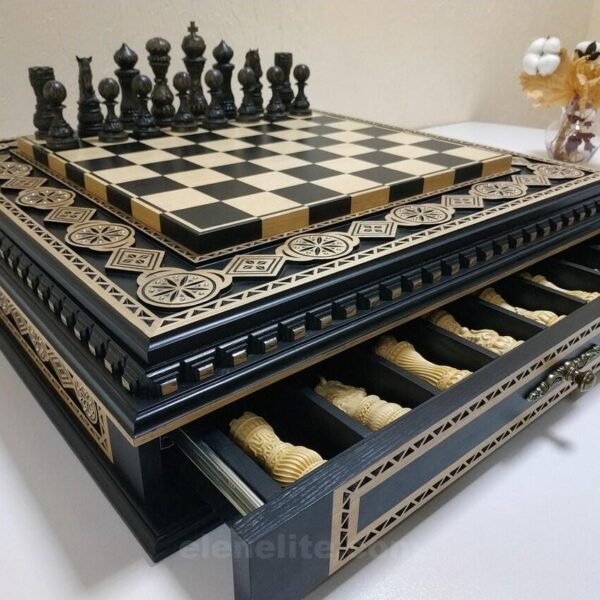 $990.15 – $1,337.45Price range: $990.15 through $1,337.45This stylish chess set will become the center of attention both in the interior and during a game. The board made of durable ash is decorated with carvings and decorated with beads, and two pull-out drawers with velvet trim inside allow you to store the pieces with the utmost care.