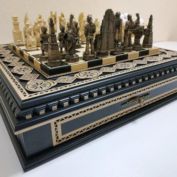 $990.15 – $1,567.45Price range: $990.15 through $1,567.45An elegant handcrafted ash chessboard, stained black and decorated with carvings and beaded inlay. It features two drawers with velvet-lined compartments for storing pieces. The chess set includes unique chess pieces inspired by Battle of Thrones characters.