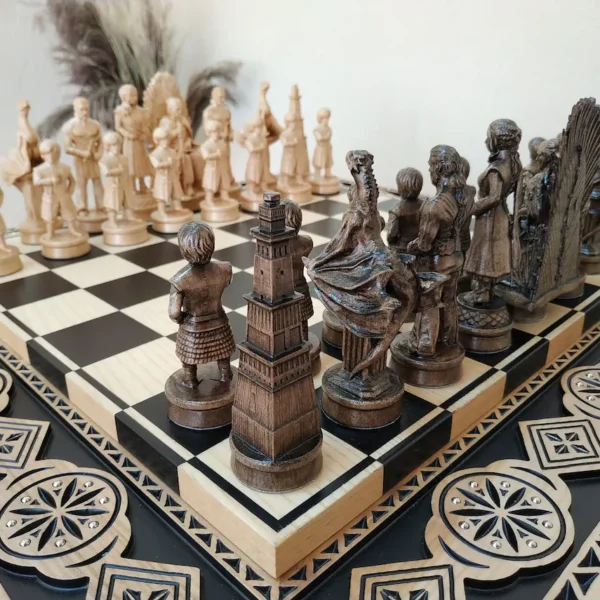 $990.15 – $1,567.45Price range: $990.15 through $1,567.45A handcrafted ash chessboard with carvings and decorative inlays. It features two velvet-lined drawers. The chess set includes 32 pieces: 16 Ukrainian heroes: Taras Shevchenko, Lesya Ukrainka, military; and 16 Cossacks – a unique combination for an atmospheric game.