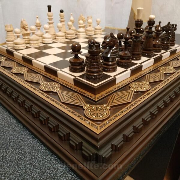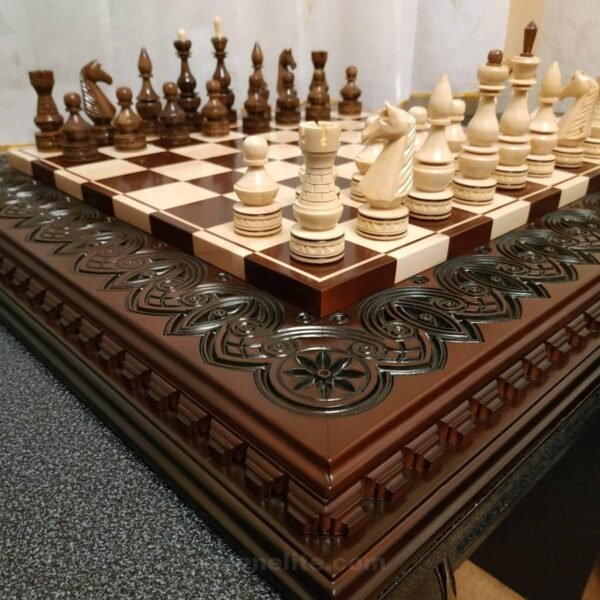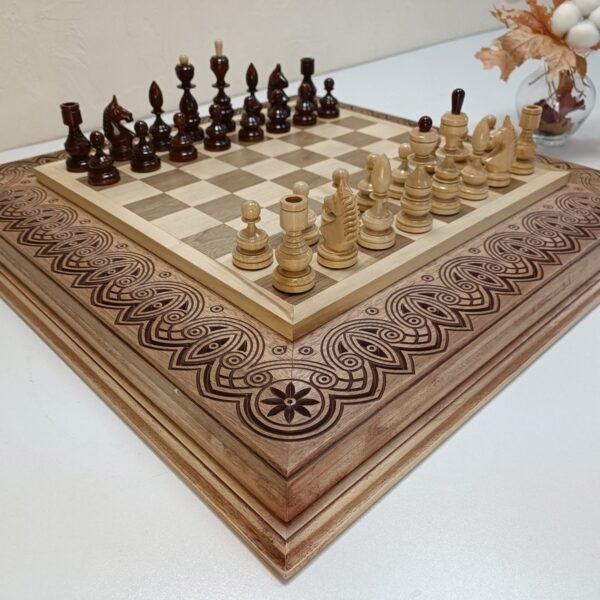 Luxury chess set: dark brown ash board with carvings and hand beading. Classic chess pieces are handcrafted from natural maple. Style, quality and aesthetics in every detail.