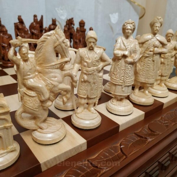 Elite chess set: carved ash board with velvet storage and unique chess pieces - 16 knights and 16 Ukrainian Cossacks.