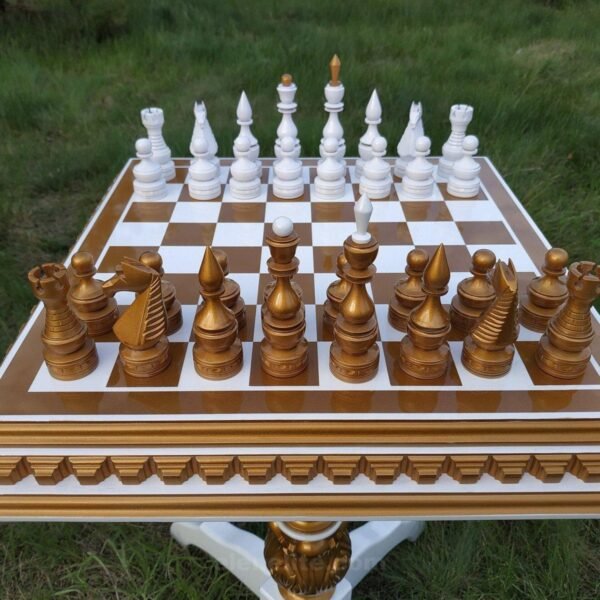 A chess set with an ash board in white and gold with a super glossy finish. The pieces are made to match the board and also have a glossy surface - style and quality in every detail.