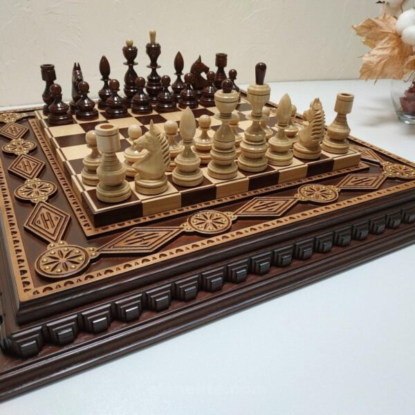 Handcrafted chess set with an ash board decorated with a carved ornament along the perimeter. The deep dark brown color gives the product solidity. Classic pieces are carved from maple - laconic, elegant and ideally suited to the set.