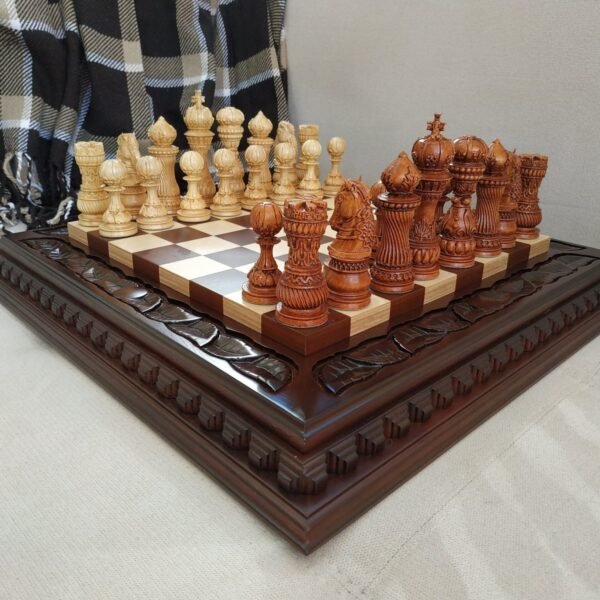 An elegant handcrafted chess set featuring an ash board with delicate leaf carvings and classic pieces designed for comfortable play and impressive decoration.