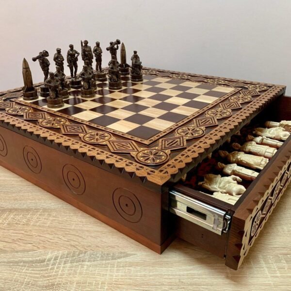A collectible chess set, handmade from ash, in a unique design with carvings and beads. Two drawers with a velvet backing carefully store 32 pieces with premium detailing - Cossacks with an ataman and warriors of the Ukrainian Armed Forces with T. Shevchenko and L. Ukrainka.