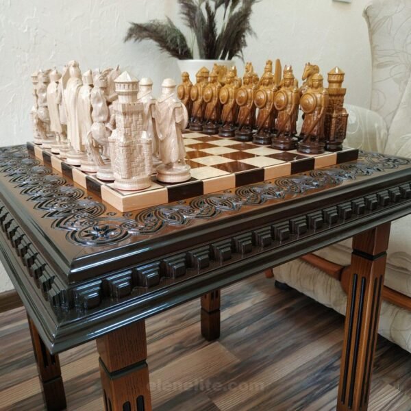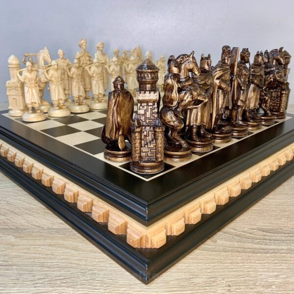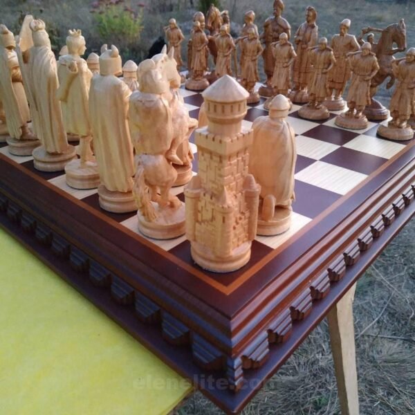 Handmade chess set consists of: classic ash board in dark brown color with carving along the edge. The set includes 32 chess pieces: 16 - Ukrainian Cossacks with the ataman as the king, 16 - in the style of medieval knights. Premium detailing - weapons, shields, clothing elements.