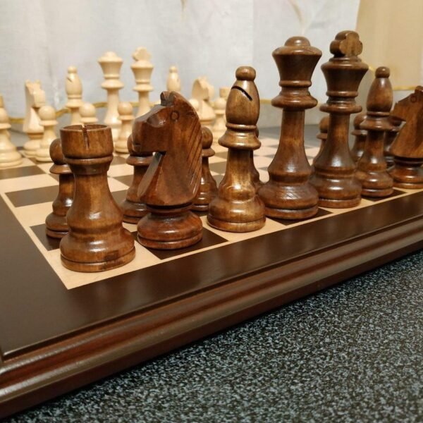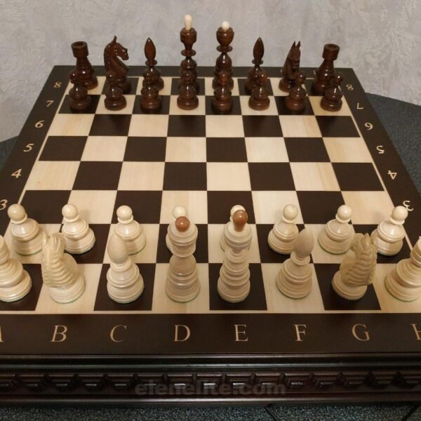 Classic handmade chess set with dark brown board and neat markings. Classic style maple pieces perfectly match the color and design of the board.