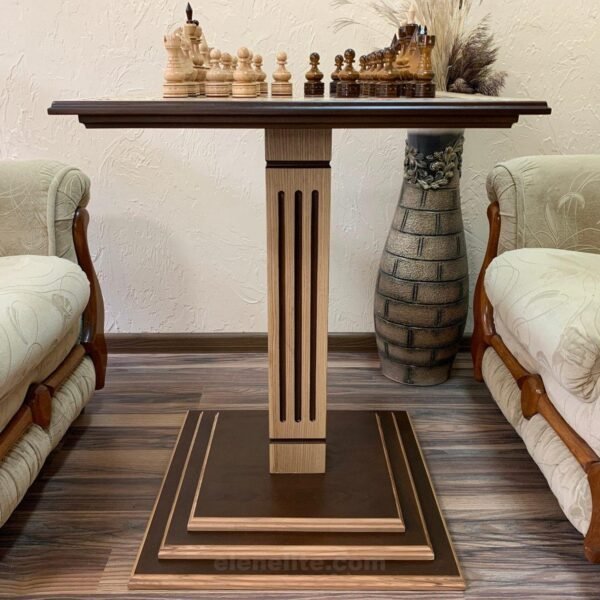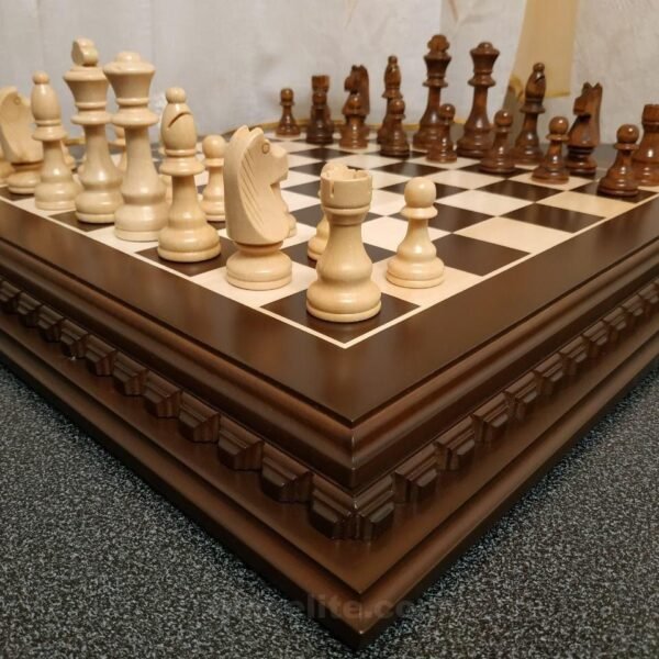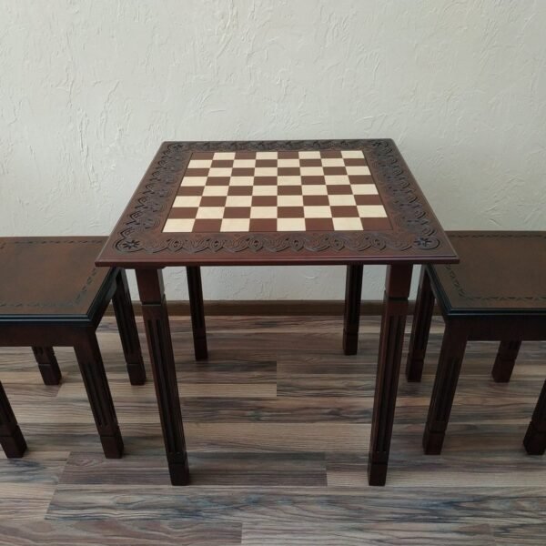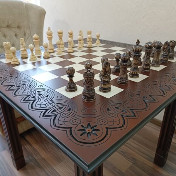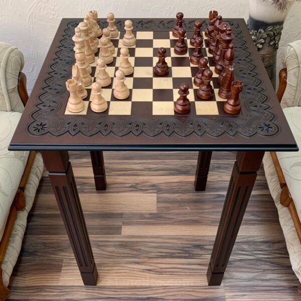 A premium dark brown ash table with four legs and a carved top, crafted in a classic style. Larger sizes are available. Classic chess pieces are included.