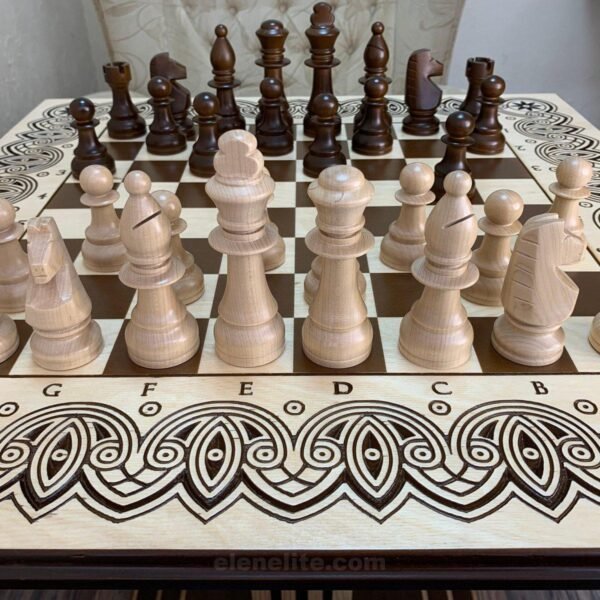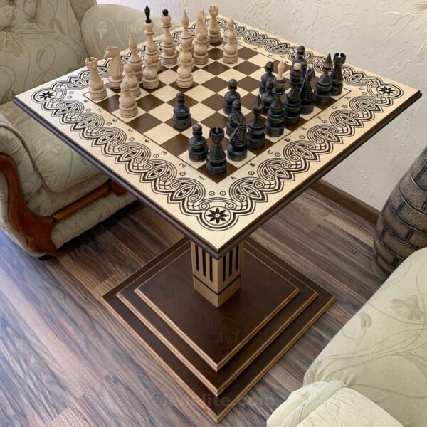 Ash chess table in brown and beige tones with elegant carvings and classic maple pieces - harmony of style and quality in one set.