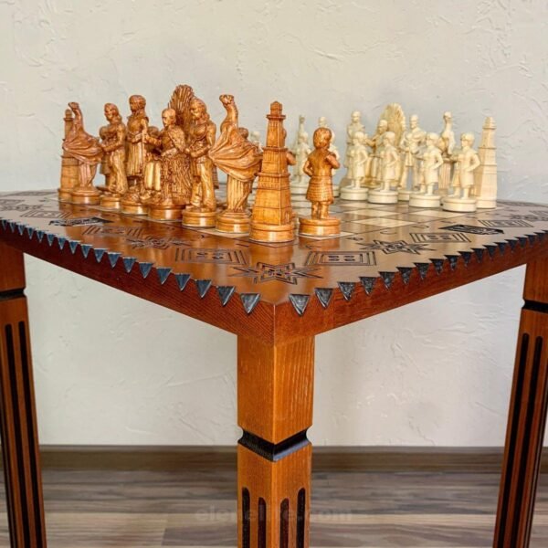 A premium chess set featuring an elegant table and unique chess pieces depicting Ukrainian Cossacks. Hand-carved details, a classic table style, and authentic wooden pieces create a striking, collectible, and expressive gaming set.