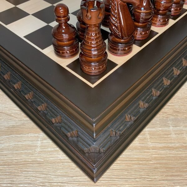 An elegant four-legged table crafted from premium dark brown ash with a carved game board. Sturdy and stylish, it comes complete with classic-style chess pieces.