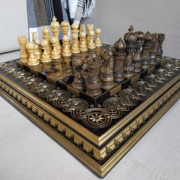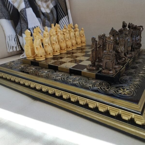 A luxurious handcrafted chess set featuring an ash board in black and gold with expressive carvings and a super glossy finish. The pieces are 16 Ukrainian Cossacks and 16 knights with premium detailing.