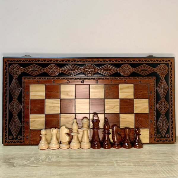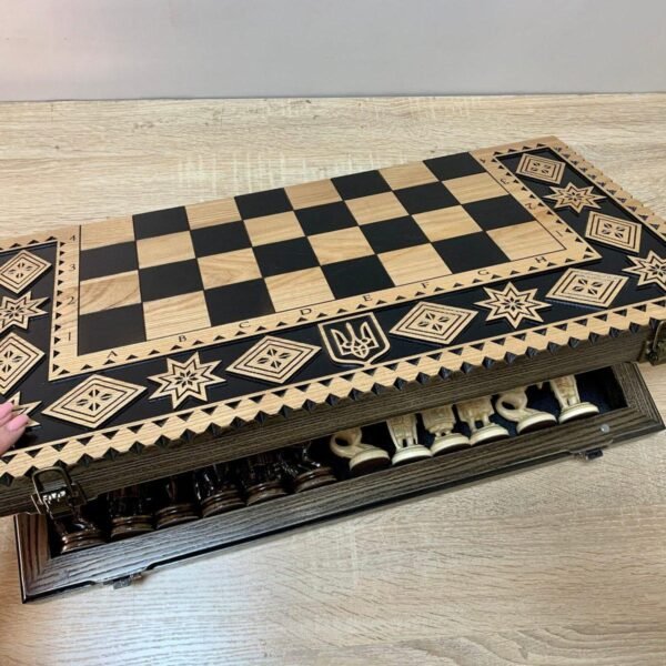 A folding chessboard with a soft velour lining and a carved surface combines style and care for the pieces. The design with an eight-pointed star and the Coat of Arms of Ukraine makes the set a real decoration for your interior.