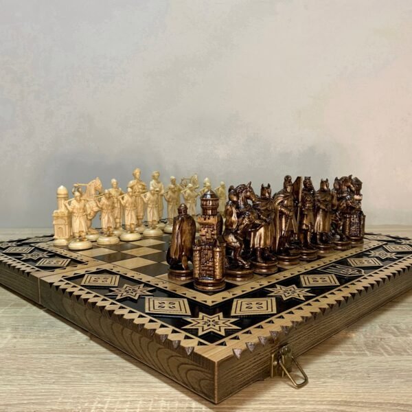 A luxurious chess set: a folding carved ash board with velvet storage and unique chess pieces - knights against Ukrainian Cossacks.