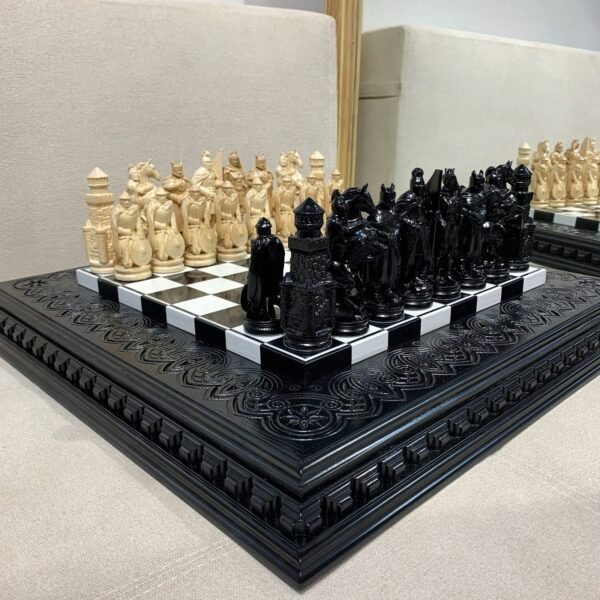 A chess set with an elegant ash board in black and white colors and a glossy finish. Handcrafted knight-style pieces painted in beige and black shades create a unique and noble image.
