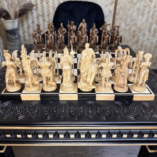 An elegant chess set with a natural ash wooden table and unique Spartan warrior pieces. Hand-carved, the classic table design, and the detailed Spartan pieces create a striking collectible set with a strong character.