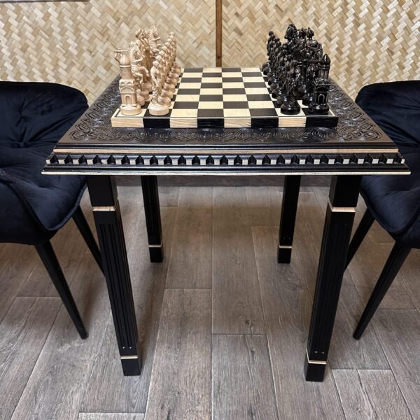 An elegant four-legged table crafted from premium dark brown ash with a carved game board. Sturdy and stylish, it comes complete with classic-style chess pieces.
