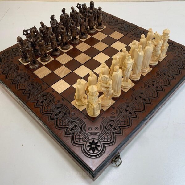 A luxurious chess set: a folding carved ash board with velvet storage and unique chess pieces - knights against Ukrainian Cossacks.