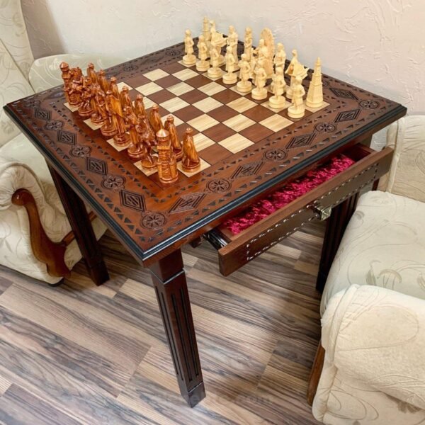 Wooden Chess set: Classic Chess Table with Drawers + chess pieces “Cossacks” & “Game of Thrones”