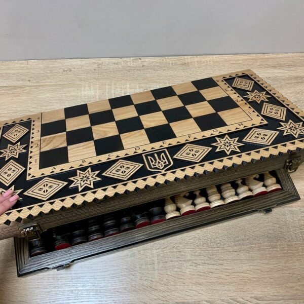 We created this chess set with you in mind: the board is foldable and comfortable, with a soft velour lining for safe storage of the pieces. The elegant design with carvings, an eight-pointed star and the Coat of Arms of Ukraine makes it not only functional, but also beautiful.