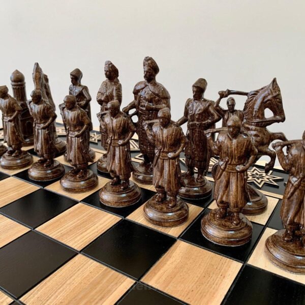 Chess set with a solid ash board in a stylish ombre color scheme and hand carving. The set includes 32 unique pieces: "Cossacks" and "Armed Forces of Ukraine". The super glossy finish provides protection and easy care. Ideal for a collection, a gift or a special game.