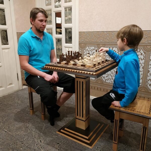 Exclusive, stunning Chess set from solid wood: Board | Table "Bright Victory" with classic pieces and two stools | chairs