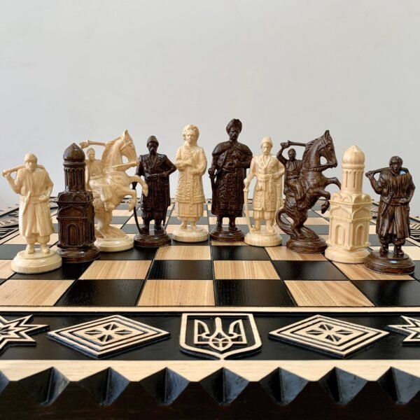 Chess set with a solid ash board in a stylish ombre color scheme and hand carving. The set includes 32 unique pieces: "Cossacks" and "Armed Forces of Ukraine". The super glossy finish provides protection and easy care. Ideal for a collection, a gift or a special game.