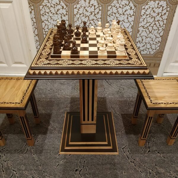 $1,511.10 – $2,417.30Price range: $1,511.10 through $2,417.30An elegant cherry-colored ash table with handcarved leaves. It comes with two stools and a classic cherry-colored chess set. The perfect set for both play and interior decoration.