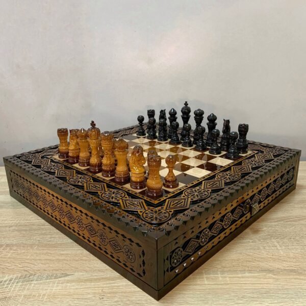 $990.15 – $1,365.05Price range: $990.15 through $1,365.05A luxury chess set with a unique design. The set includes a board with beautiful carvings and bead inlay and two drawers. And 32 classic chess pieces that fit perfectly with the board.